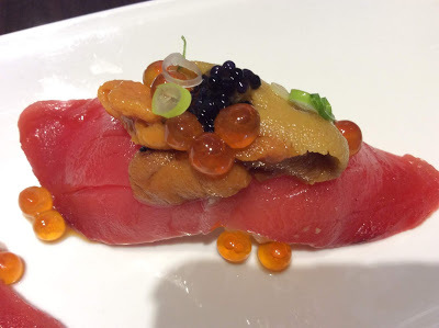 漂亮又豐腴的鮪魚,上面還附加著海膽和鮭魚卵;
