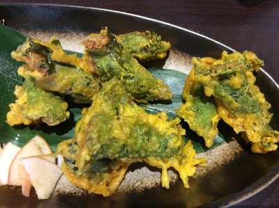 用紫蘇葉包裹著雞腿肉、麵糊炸著吃,表皮酥脆,葉片香氛,