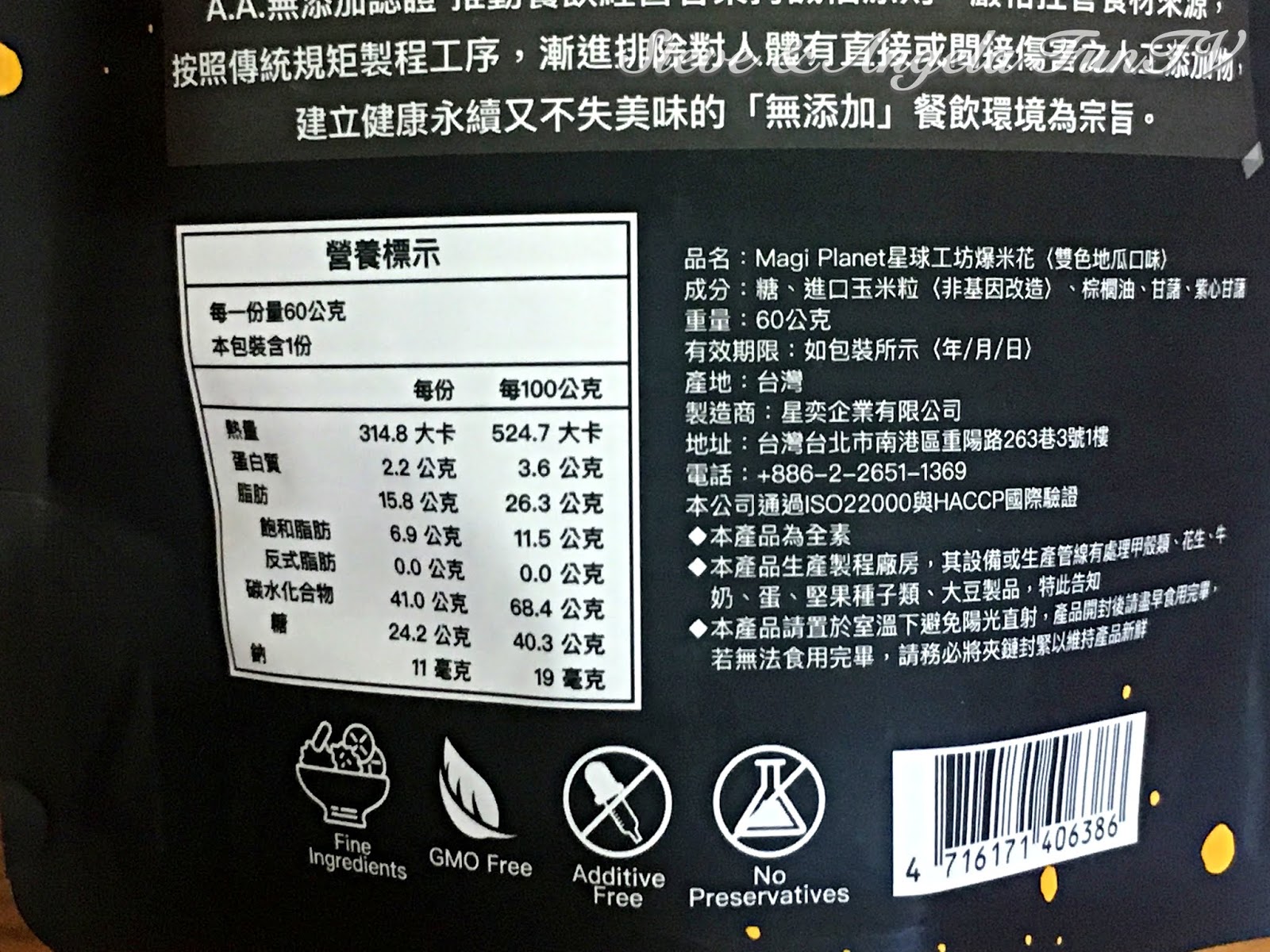 高雄 – 漢神巨蛋(高雄市左營區博愛二路777號B1)Magi Planet星球工坊這次特別和台南新化的瓜瓜園合作,使用台灣在地的農產品:地瓜來做為爆米花調味的原料,話說我們過年剛去新化的瓜瓜園,所以看到這個特別有感,Magi Planet星球工坊使用台農57號黃金地瓜(Steve的最愛)和台農73號紫心地瓜來當作食材,加入非基改的爆米花中,無任何添加物和防腐劑,而且只有使用5種成分,而且每一種成分都很天然,我都念的出來,沒有任何化學原料,雖然棕櫚油不算是太健康,但是和市面上零食來比較,Magi Planet星球工坊的爆米花真的是太健康的選擇了!