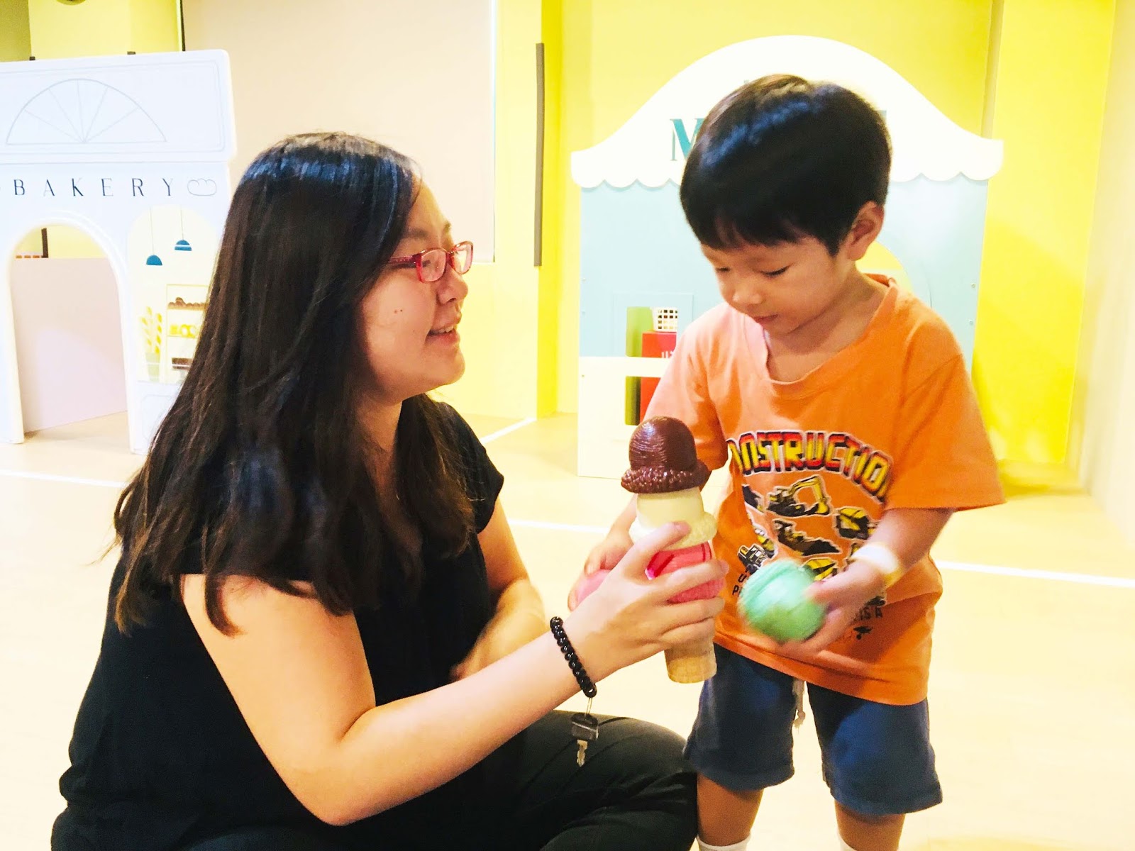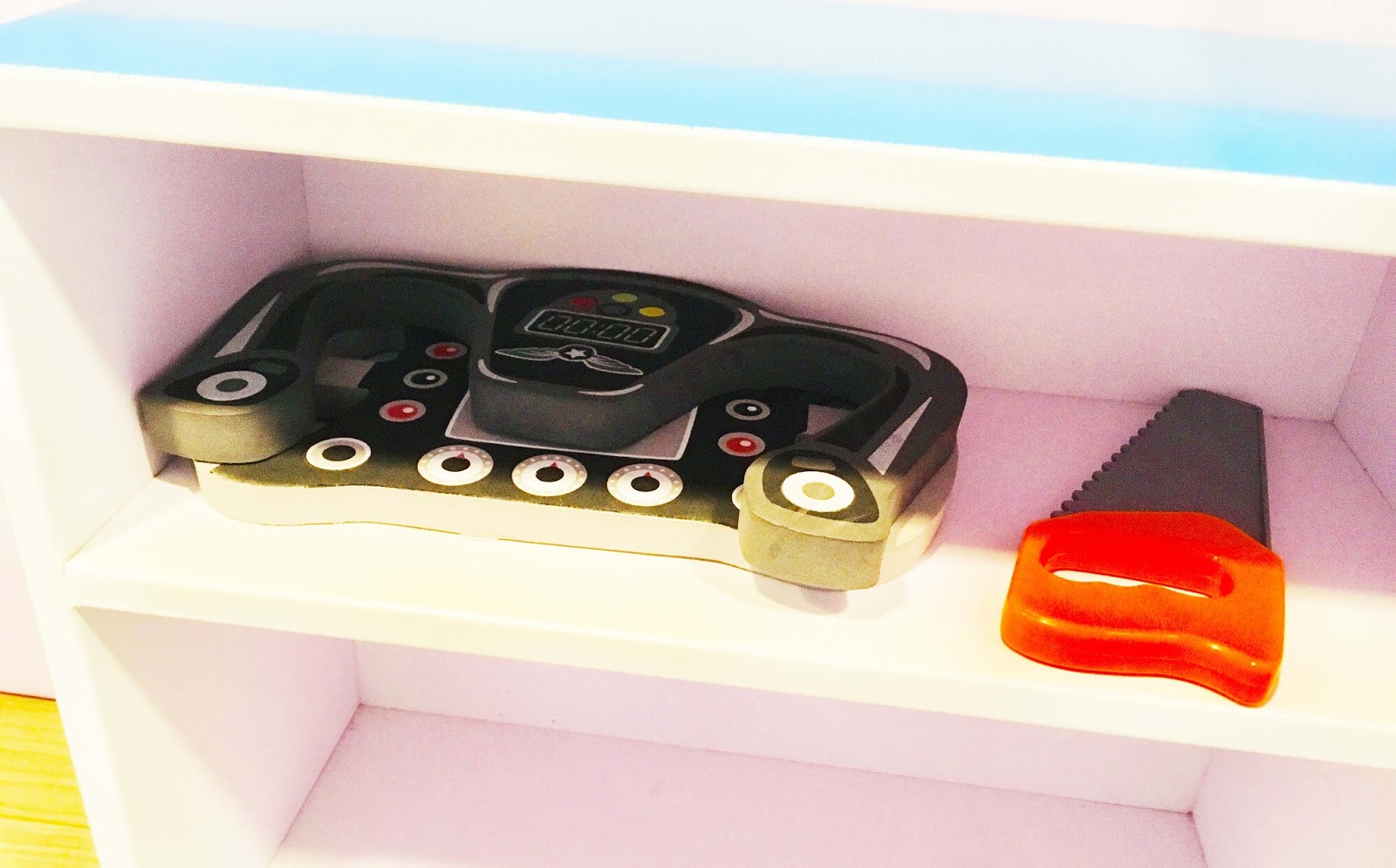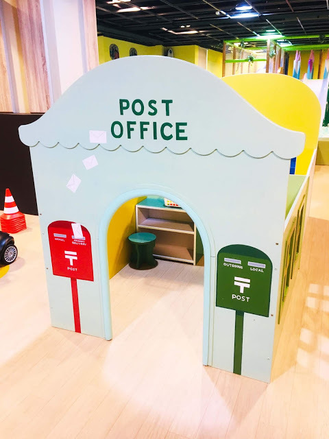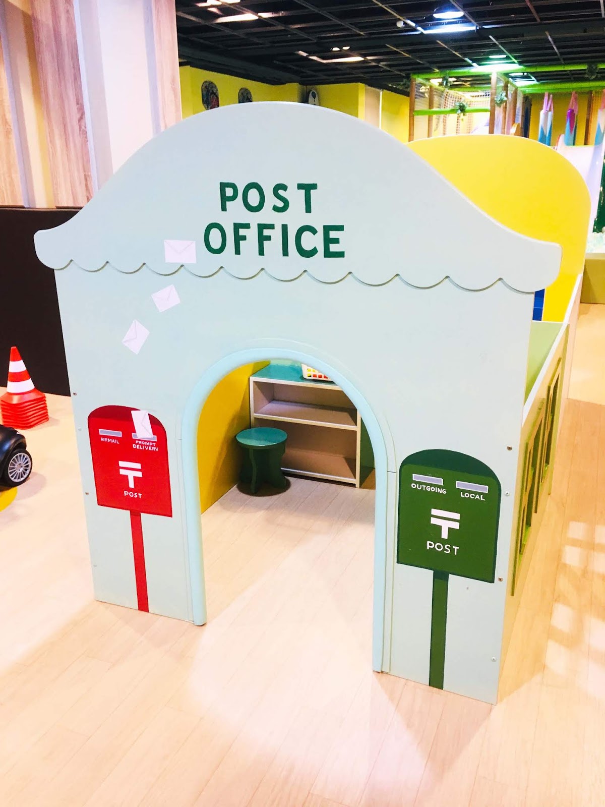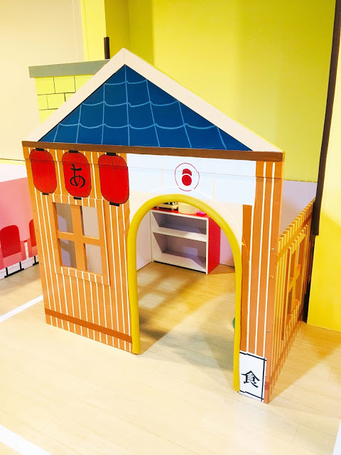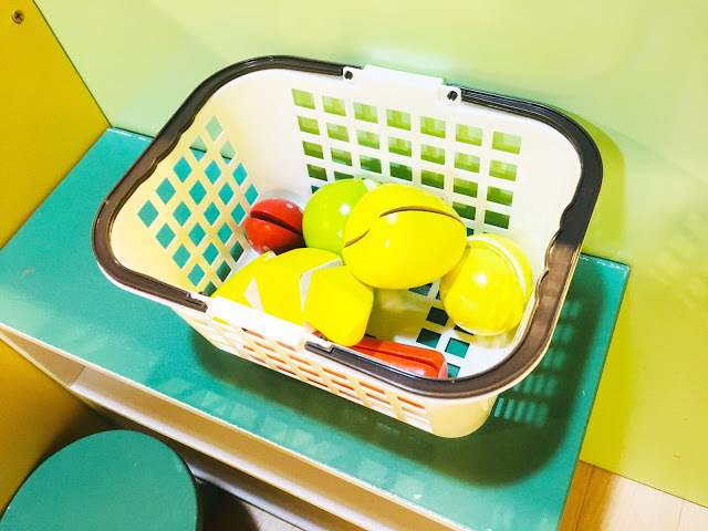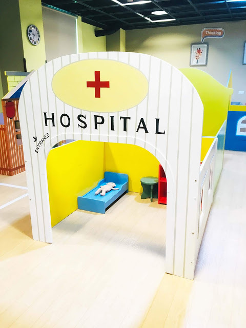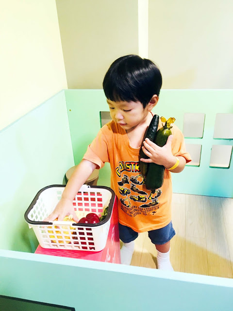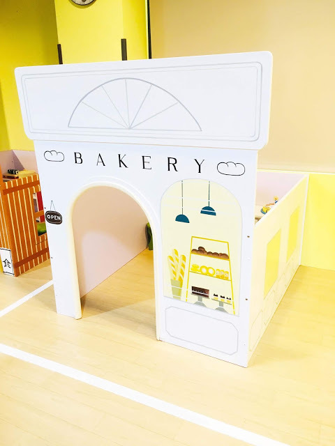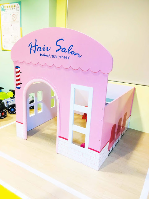 「一日小店長」是個可愛的小社區,有各式情境的木造小房子,包括:賽車保養廠、警察局、超市、麵包店、壽司店、髮廊、郵局、醫院...,裡頭也有對應的主題玩具,孩子可以在各個情境中切換不同的角色。小福寶一下在超市買菜,一下扮演醫師幫小寶寶做身體檢查,忙得不亦樂乎。