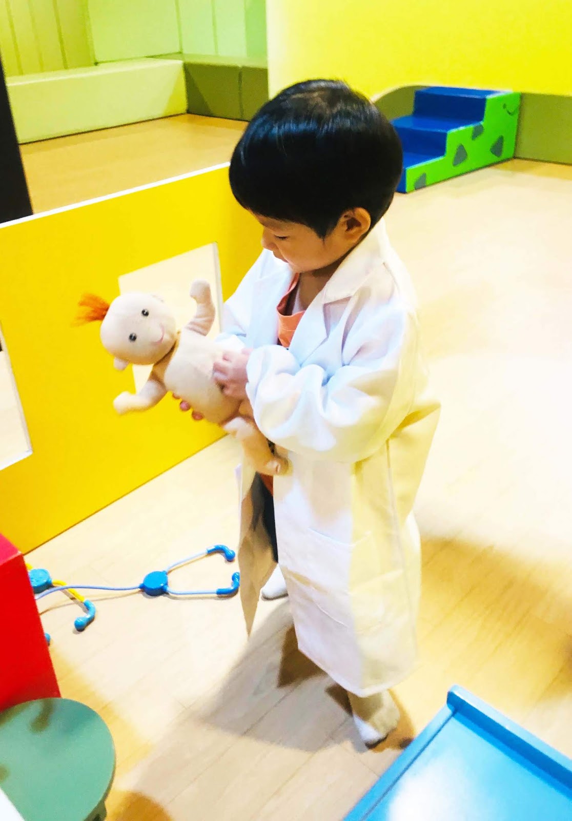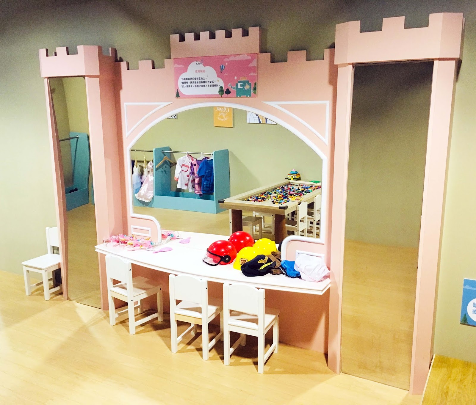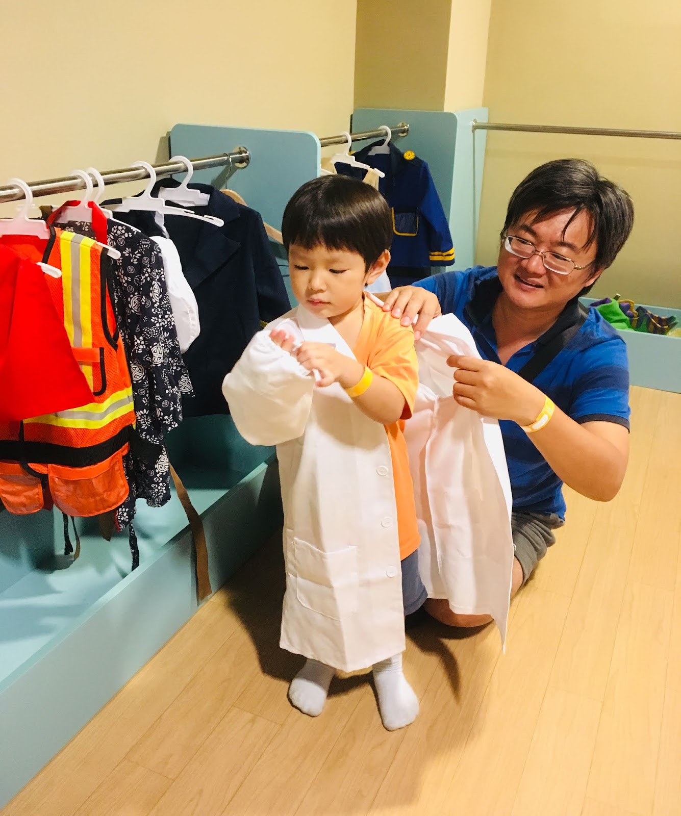 在「角色扮演區」,孩子可以梳妝打扮成醫師、廚師、警察、消防員、建築師...等職業,也有各式美美的公主裝。小福寶穿上醫師袍,有模有樣地幫我們做檢查,實在好可愛,透過模擬職業體驗,孩子能夠在職涯探索的同時,更認識社會上的各行各業。