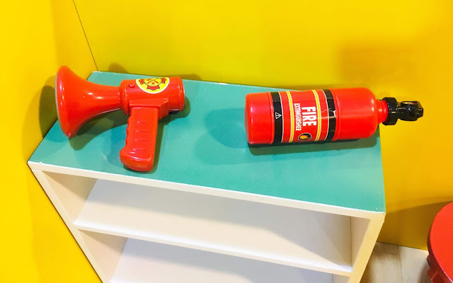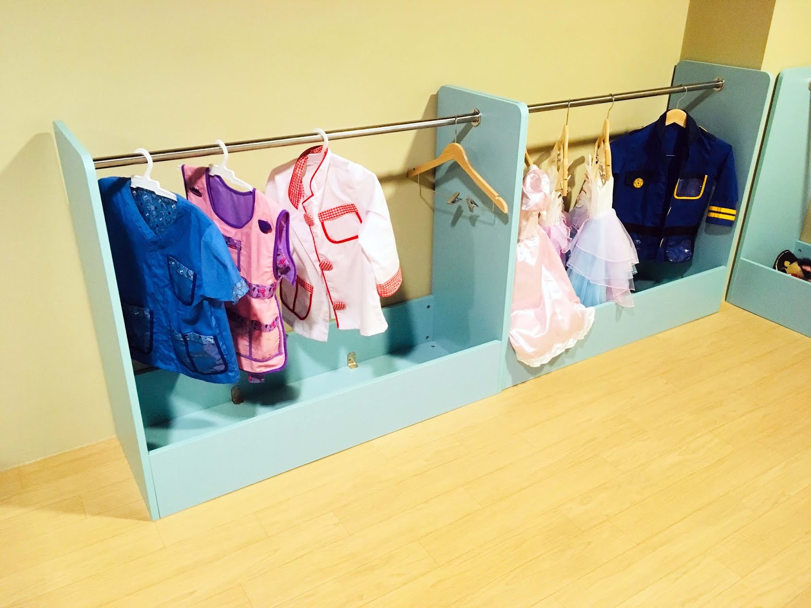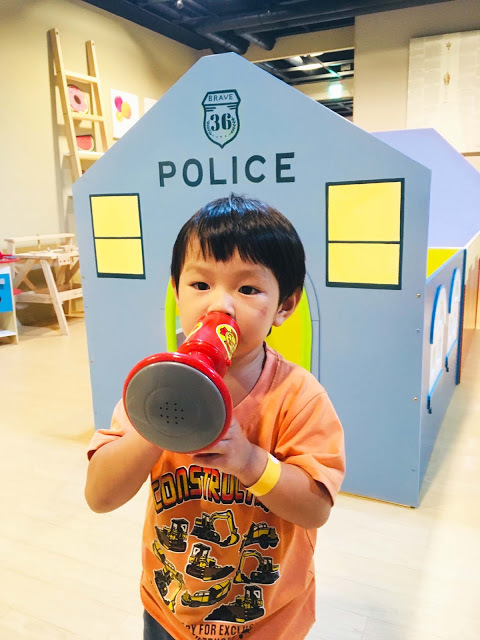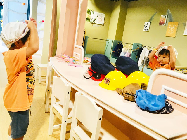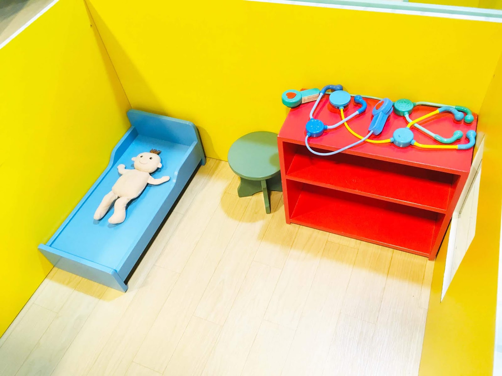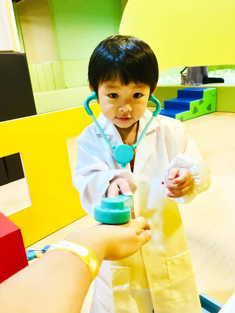 在「角色扮演區」,孩子可以梳妝打扮成醫師、廚師、警察、消防員、建築師...等職業,也有各式美美的公主裝。小福寶穿上醫師袍,有模有樣地幫我們做檢查,實在好可愛,透過模擬職業體驗,孩子能夠在職涯探索的同時,更認識社會上的各行各業。