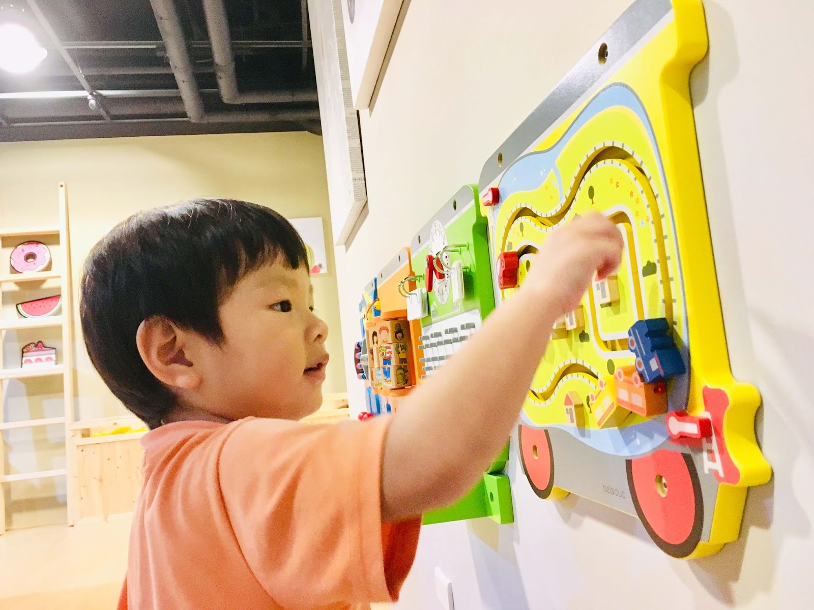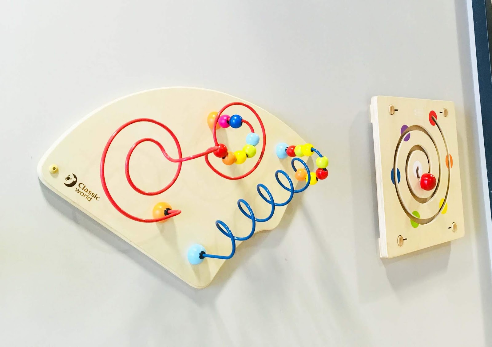 牆上有串珠玩具和軌道玩具,可以幫助孩子在遊戲中培養上臂到手指的動作控制,也有算盤、時鐘來訓練數的概念,或翻轉方塊來幫人物穿搭衣服,孩子在牆邊就可以玩上一段時間。