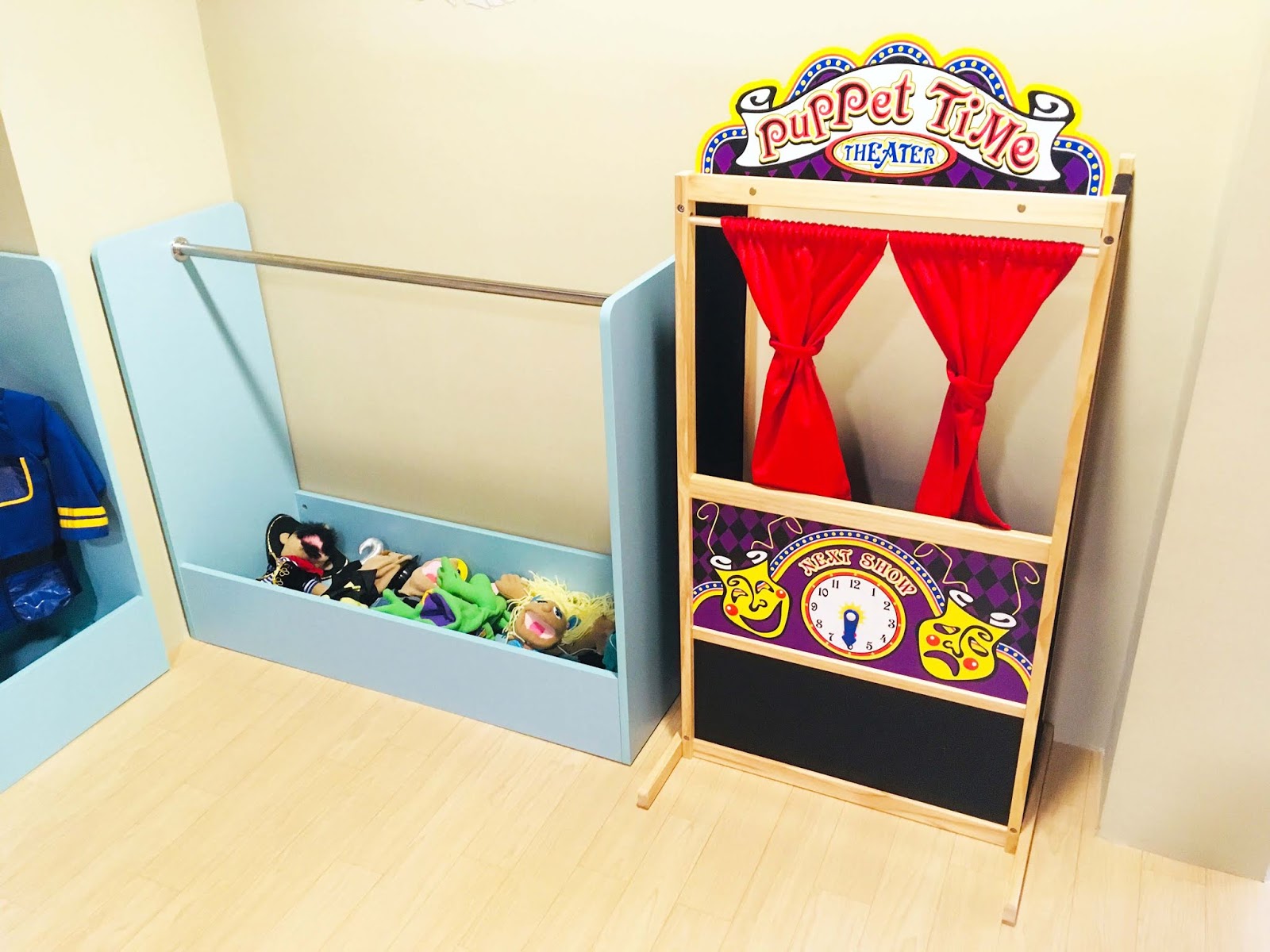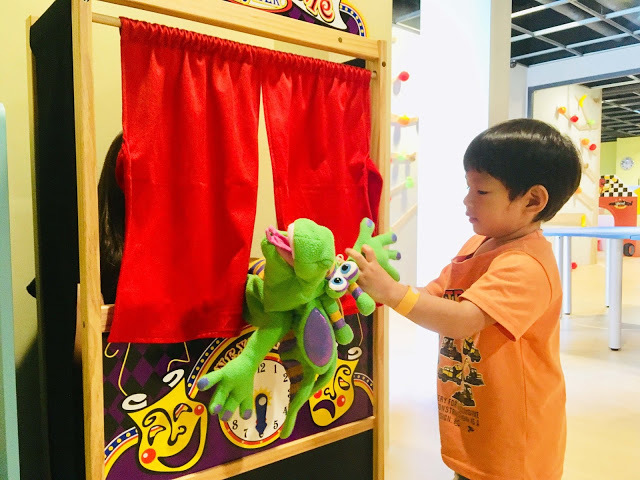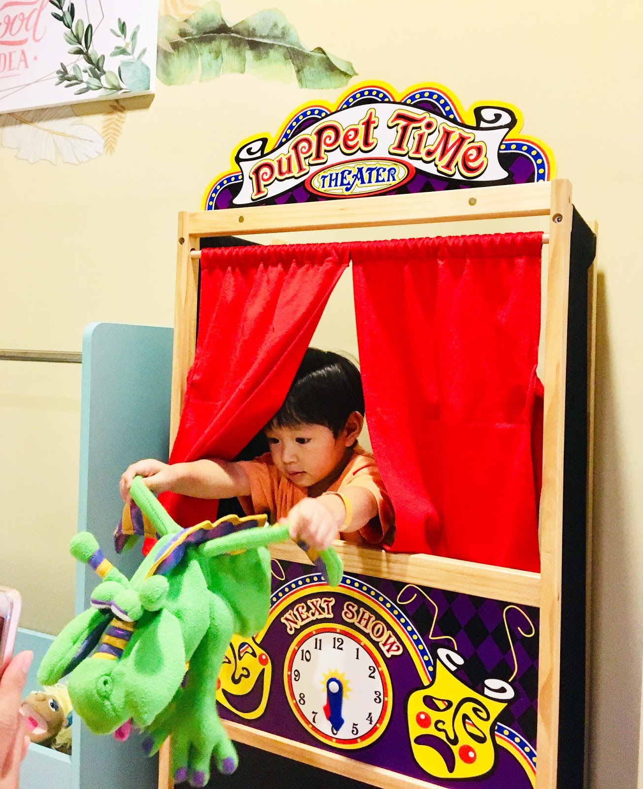 「手偶區」有個小舞台,可以用手偶扮演各式各樣的角色,小福寶從欣賞媽媽演出,到自己主動上台表演,是很有趣的轉變。看他演出自創的噴火龍故事,發現他已經有換位思考的同理心了!