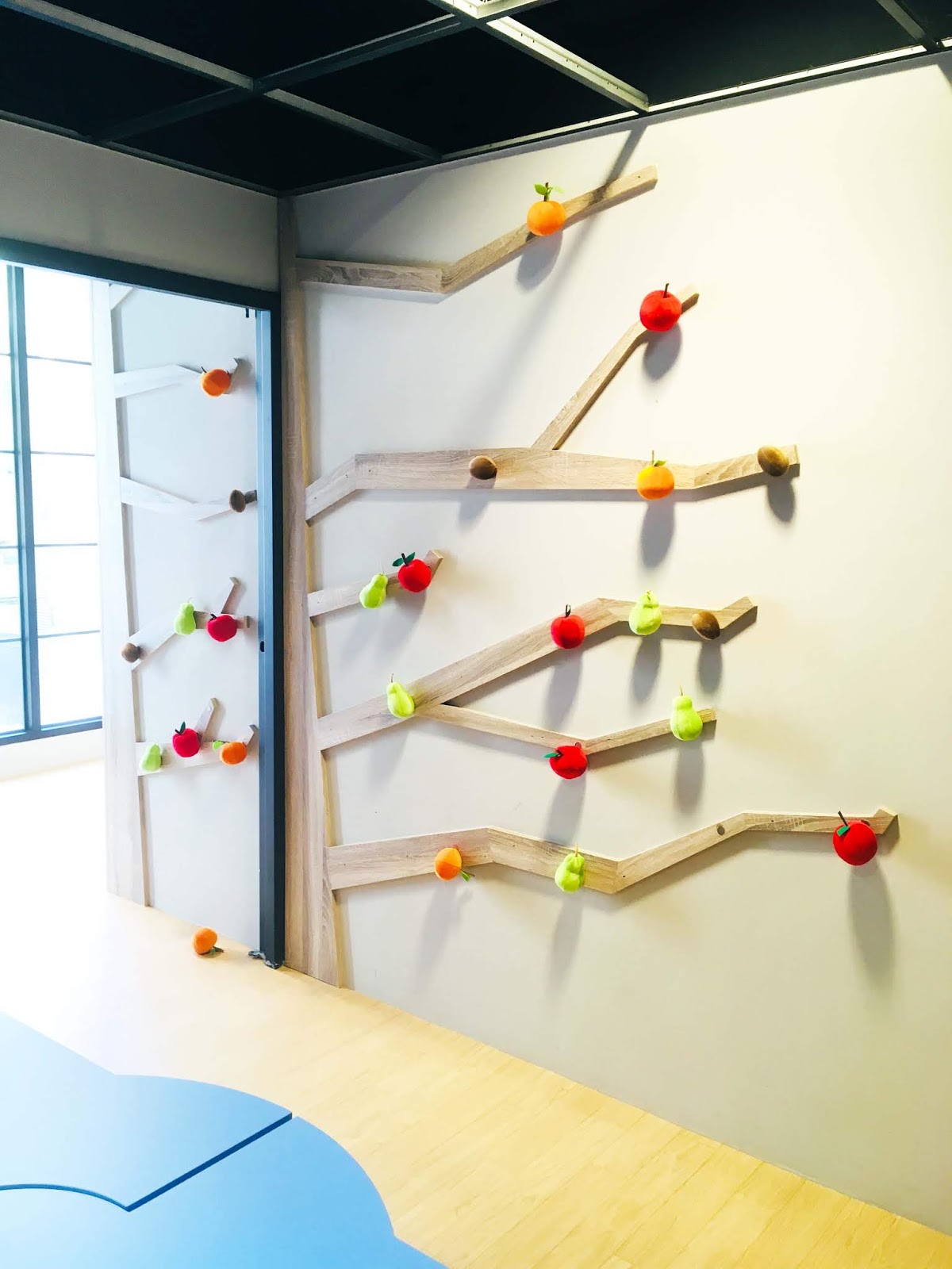 「手眼協調區」的牆壁上有水果樹,孩子可扮演快樂小果農摘取樹上的蘋果、橘子、梨子、香蕉、奇異果...,並可練習分類水果和數數,將水果放回樹梢上時,也需要對準樹枝上的磁鐵,培養手眼協調能力。