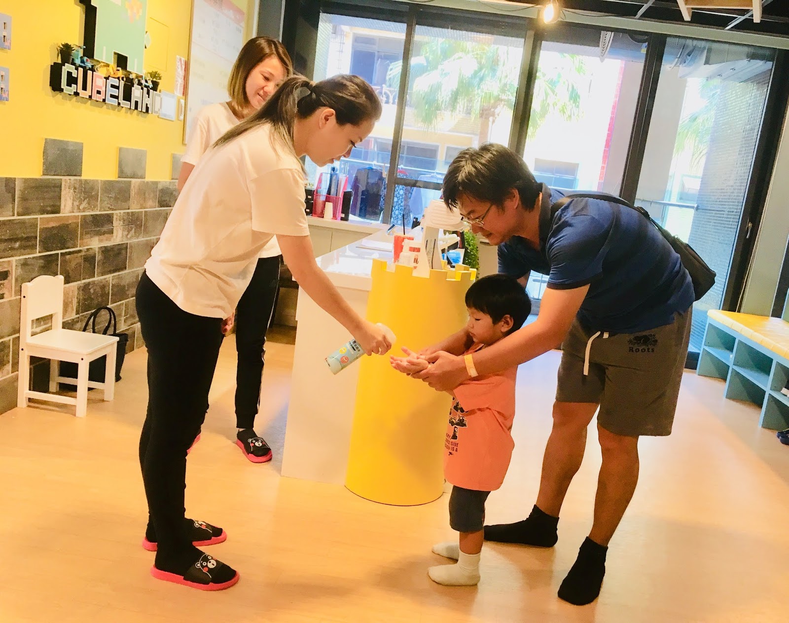 為維護公共衛生和個人維生,服務人員建議我們入園前先如廁洗手,幫我們量體溫及消毒手部,並提醒大人、小孩都需要穿著襪子才能進場喔。