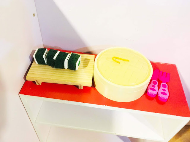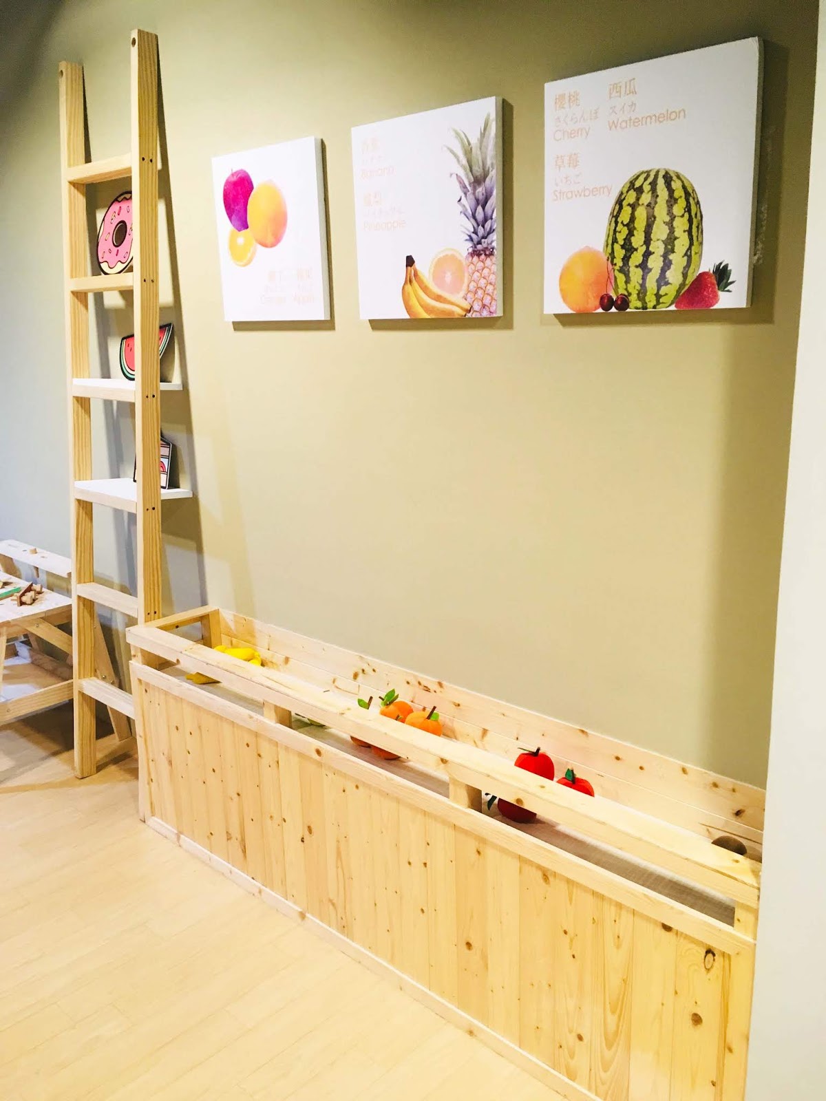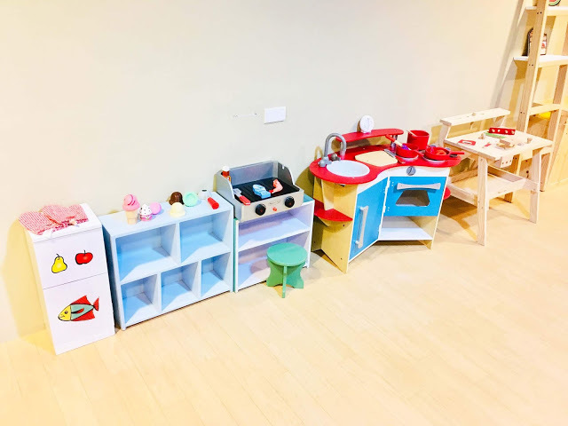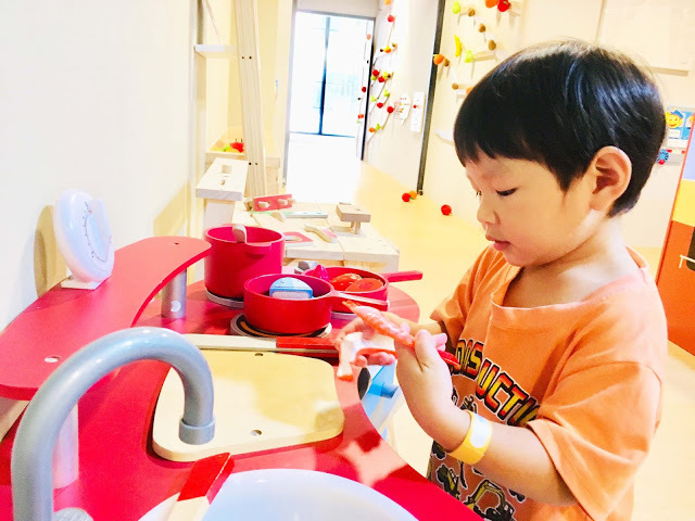 「木質玩具區」有多種木製廚房和工作台,小福寶在這裡練習洗菜、切菜、煮菜、烤肉、做冰淇淋等,模仿大人烹飪的熟練模樣,原來平常都有在默默觀察啊。