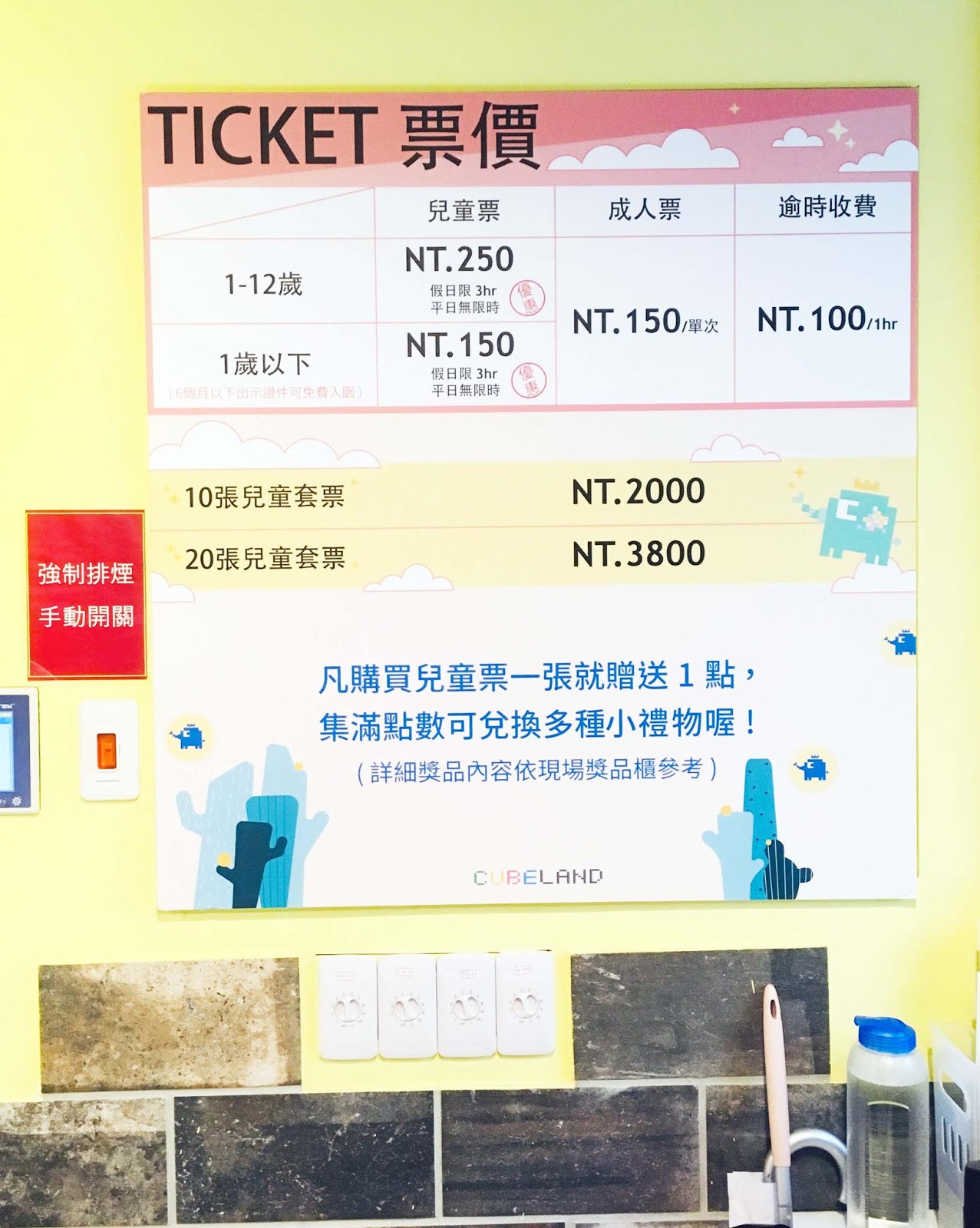 票價1-12歲兒童是250元,6個月-1歲幼兒是150元,成人是150元,還有套票和不定期優惠,假日限時3小時,平日來還可以不限時玩一整天,以親子樂園來說蠻平價的,如果能和其他媽媽團購套票會更划算。