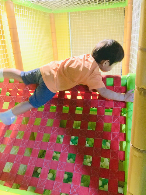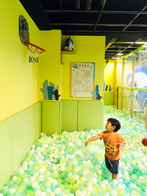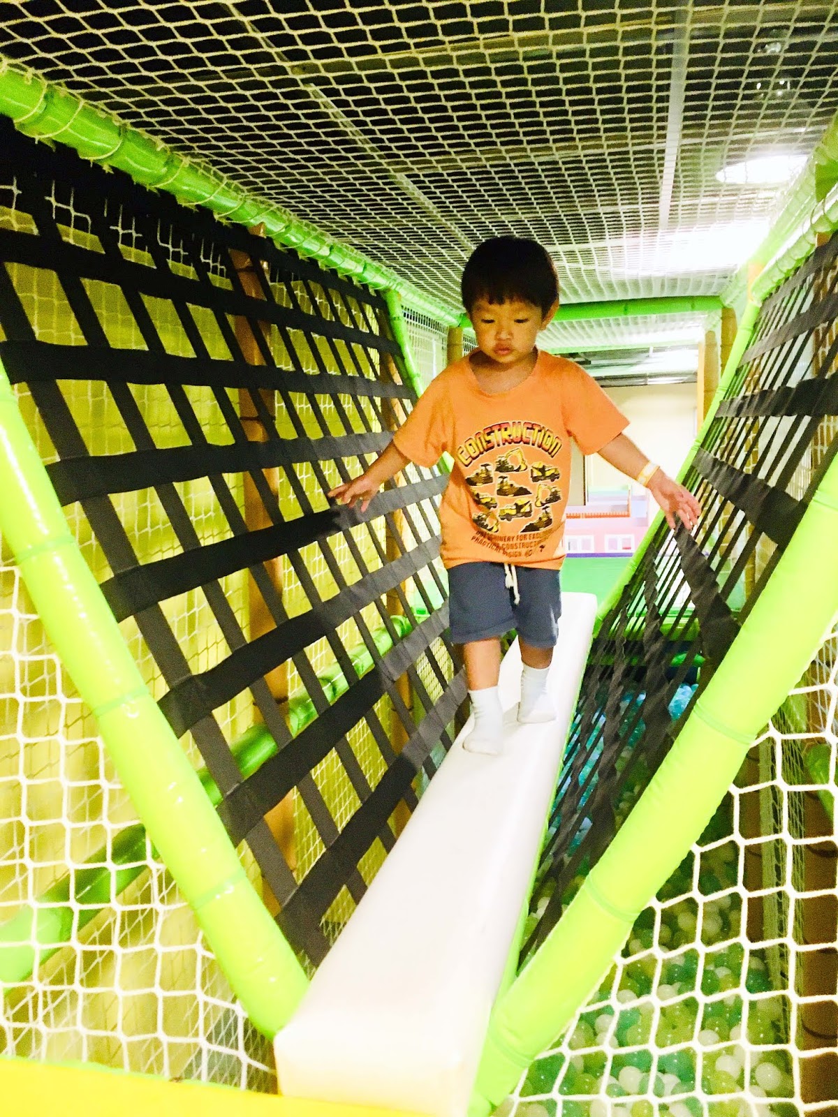 「夢幻球池區」據說是三鶯最大的球池,草綠色的球球滿佈的畫面好夢幻,小福寶拾階而上,裡頭有感統設施可以挑戰動作計畫,提供本體覺和前庭覺的回饋,最後再從溜滑梯咻地溜下來。對孩子來說,這是園內最精彩刺激的一區,很多常客一入園就是直奔球池。