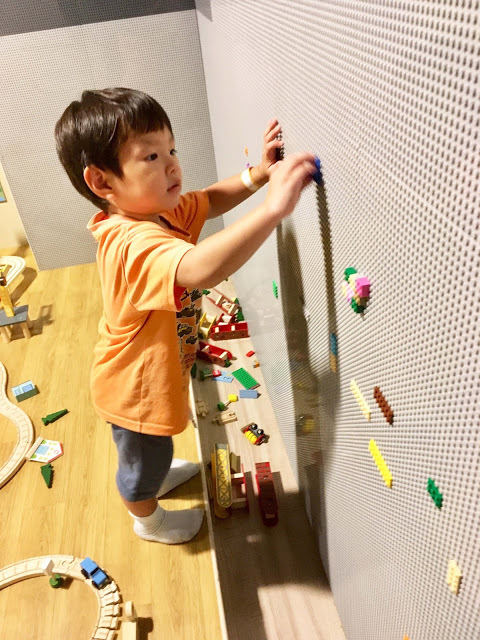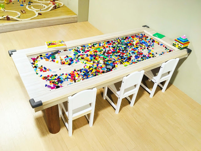 長桌上有許多小樂高,藉由組合小樂高,會鍛鍊到孩子的精細動作、空間概念和創造力...等,可做巨幅創作的大面「創意樂高牆」,讓孩子無限寬廣的想像力可以完全釋放。