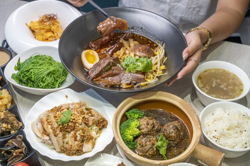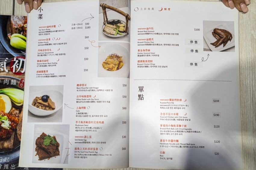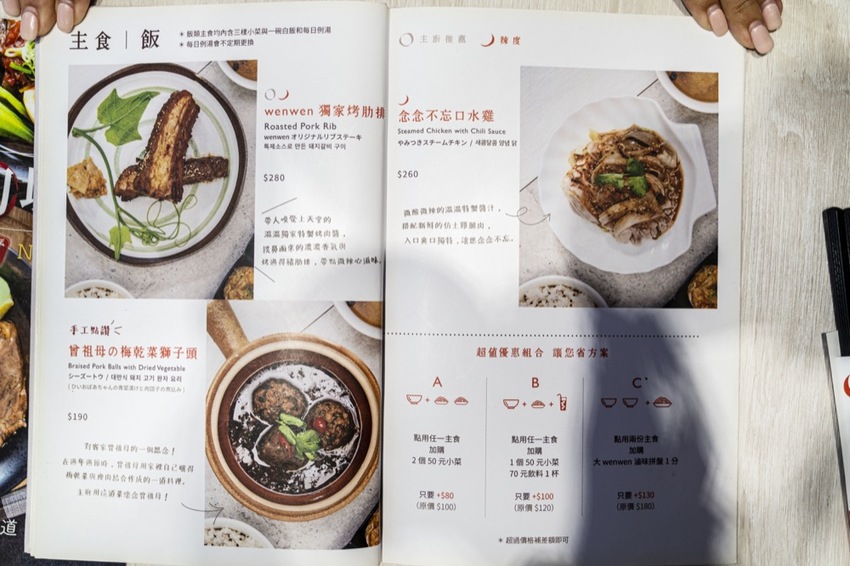 除了麵食之外,還有三道主食、小菜和湯品。主食的部分可以依照個人喜好選擇加購套餐來搭配,A套餐點用任一主食,加購2個50元小菜只要80元;B套餐點用任一主石,加購1個50元小菜、70元飲料一杯只要100元;C套餐點用兩份主食,加購一份大wenwen滷味拼盤只要130元。