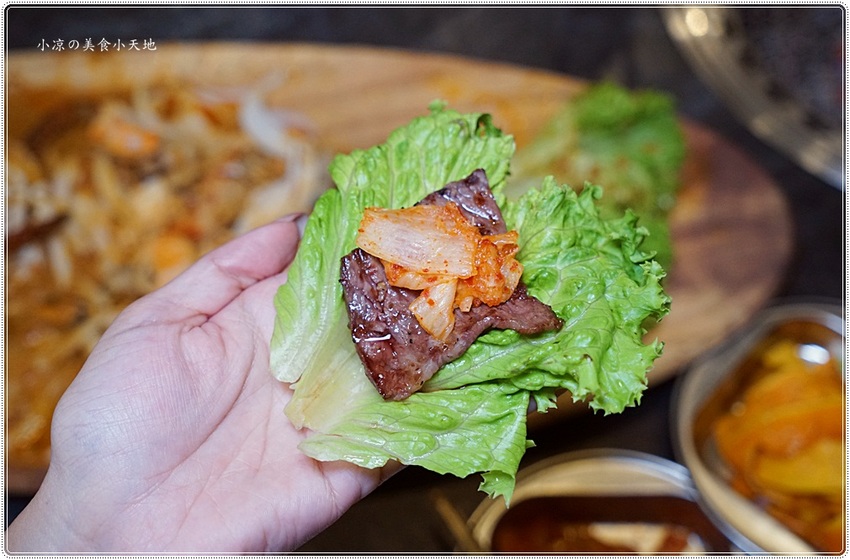搭配著鮮脆生菜、韓式泡菜一同入嘴,泡菜中的辛更提升了肉香的美