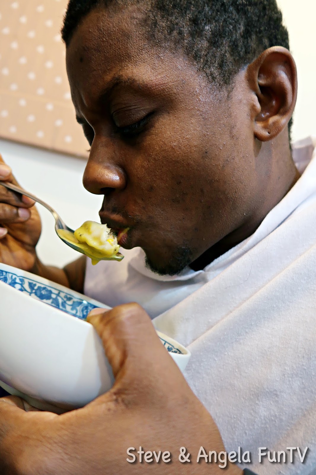 There's a lot of corn inside the soup. I like to add some type of vegetable in the dumplings to make it shine, like chives, celery, carrots, cabbage, or here we have corn! By the way, we always appreciate company like Queen Yu Homemade Dumplings who choose to use Non GMO corn.我們家吃飯,不喜歡吃太多的澱粉,如果單吃水餃要吃個8-12顆才會飽,但是如果配上其他東西,像是今天的濃湯,Steve吃4顆玉米水餃配上半碗湯就滿足了!