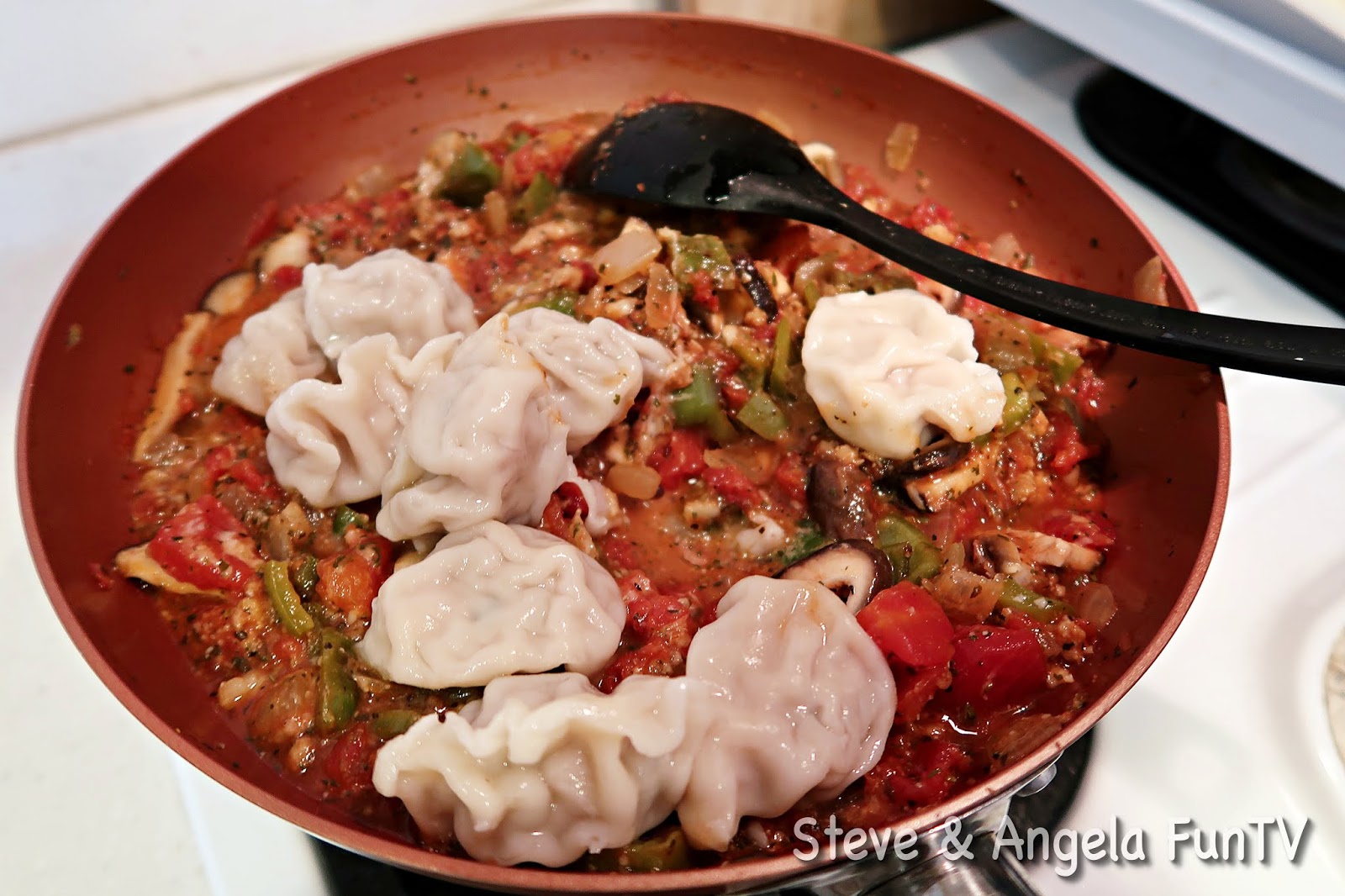 This dish requires to cook the dumplings twice. The first time to cook it in the boiling water, and second time to stir in our homemade marinara sauce. I was so surprised the dumplings are still in the great shape after cooking it twice. Since Queen Yu Homemade Dumplings' wrapper are thicker, it can totally handle double cooking or even reheat process. The wrappers stay chewy and don't turn out soggy or doughy.