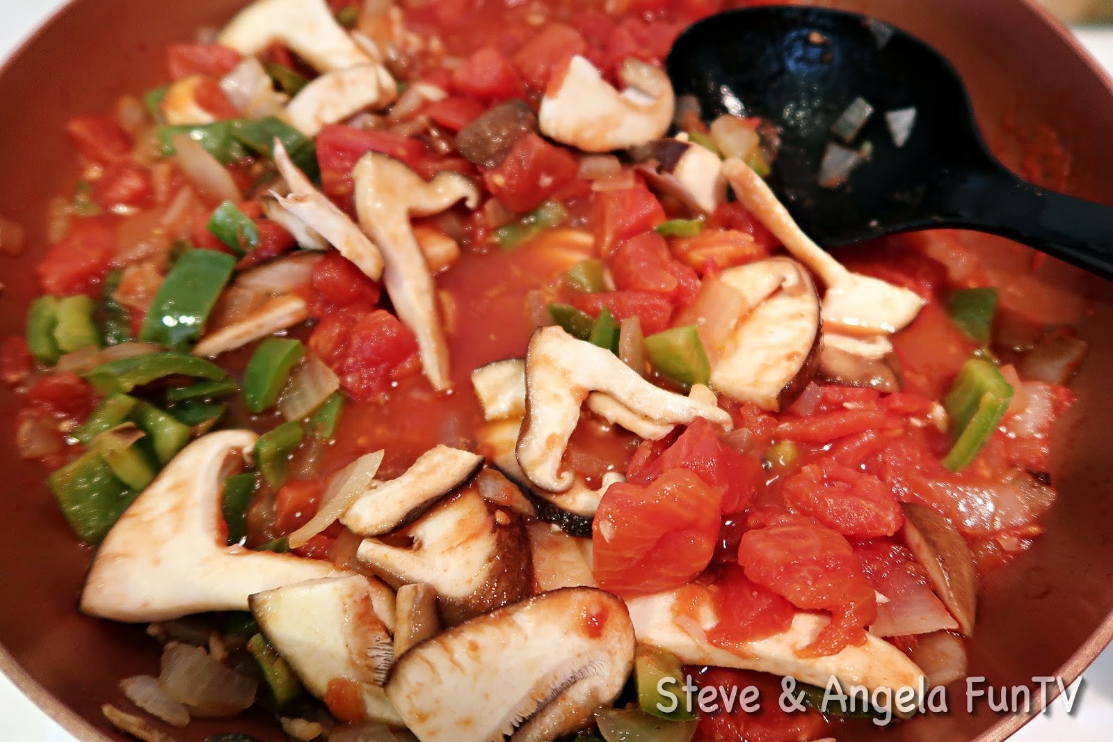 1. First we are going to make our own marinara sauce by sautéing onion, mushroom, green pepper, black pepper and salt together. The salt will soften the vegetable while cooking. (You may put any vegetable that you like.) Then add in a can of diced tomato.2. 加入傳統的肉醬香料,包括:皮薩草、羅勒、洋香菜等,或是可以直接選擇放入市售的義大利香料。