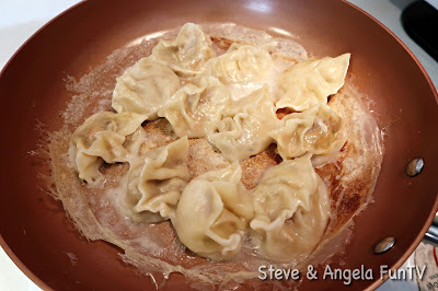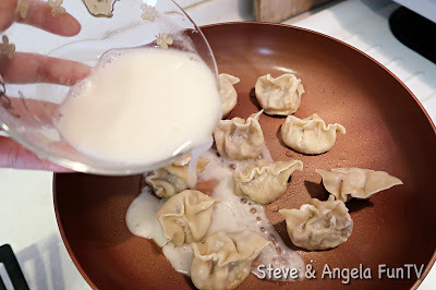 6. The mixture should come up to about quarter of the dumplings. (The bigger pan you use, the more water you need in order to cover the whole surface. You may add some more water to reach the desired level.)7. 蓋上鍋蓋,慢慢等到餃子慢慢蒸熟。