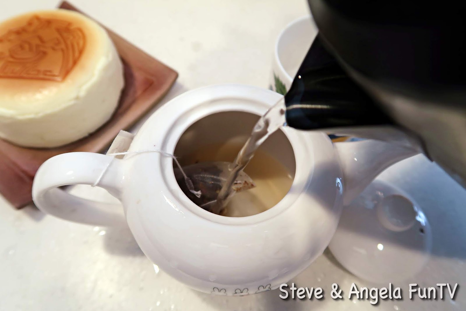 Let the string of tea bag goes through the handle of the kettle in order to avoid the entire tea bag fall into the bottom of the Kettle.泡茶咯!熱水一加進去,馬上可以聞到花香。