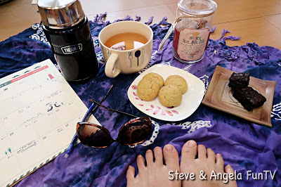 Another great thing to take for outing is a good thermos. It has to be big and hold the temperature well for both hot and cold drink. And this is why I was able to bring hot water to make tea outdoor. 這次的甜點就是我自己動手製作的蛋黃奶酥餅乾和布朗尼,再配上溫溫的多穀紅藜茶,這個茶聞起來有烘烤玄米的味道,喝起來香但是有一種苦澀的味道,不是像苦茶那種的苦,而是在米香後有一絲苦澀味,搭配濃郁的布朗尼,真的超級對味。