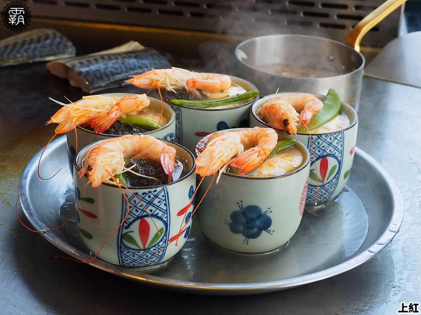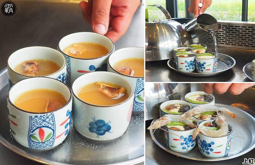 「日式茶碗蒸」現點現做,而且是從客人就座後才開始一步步的蒸煮,蛋液、高湯、香菇先蒸過一輪,再放入松露醬、甜豆,最後一輪還會再放一尾白蝦,真的很澎湃。