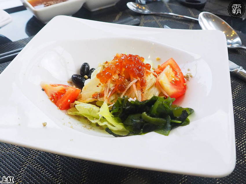 「日式堅果鮭魚卵和風沙拉」以新鮮的蔬菜、黑豆、海帶芽搭配碎堅果再加上一大匙的鮭魚卵,而且咬破鮭魚卵還會有波波波的香鹹味增添整體的層次感,微微酸甜吃起來很開胃。