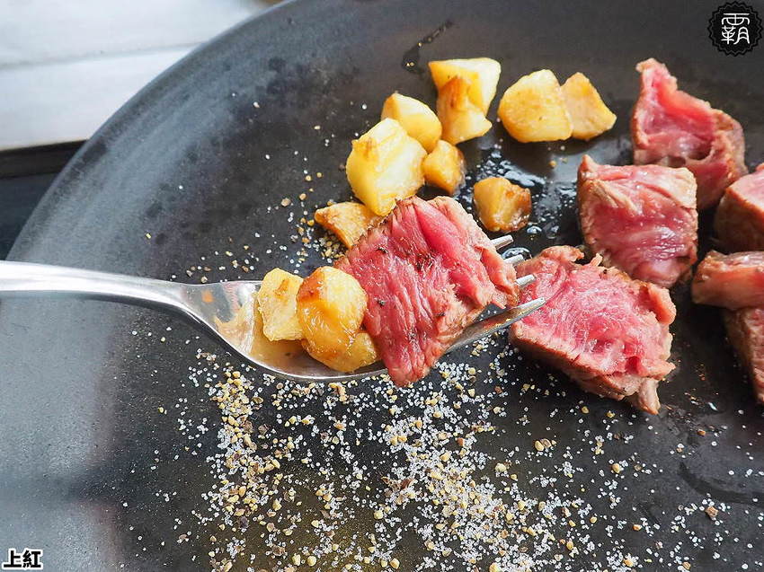 店內牛排皆採五分熟的熟度,從斷面可以看到中間還是暗紅色的模樣,厚切沙朗牛排還會用白蘭地點火去燒過,用來增添整體的香氣。