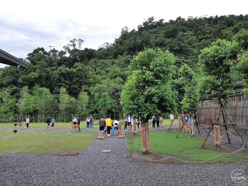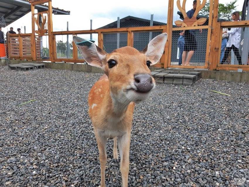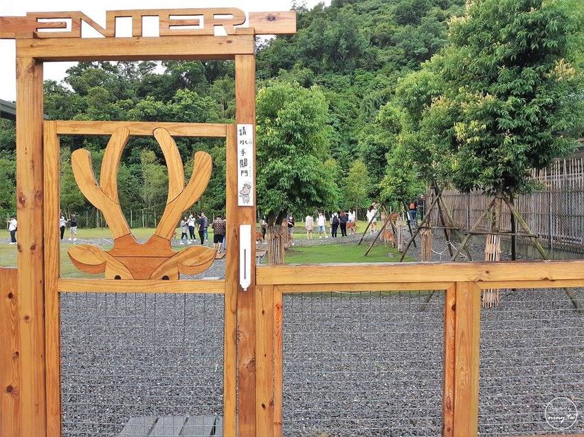 過了這個門就是梅花鹿互動區,其實園區比想像中的還要大,雖然不能跟奈良比不過也很足夠了,裡面也大約有二十多隻梅花鹿可以互動。