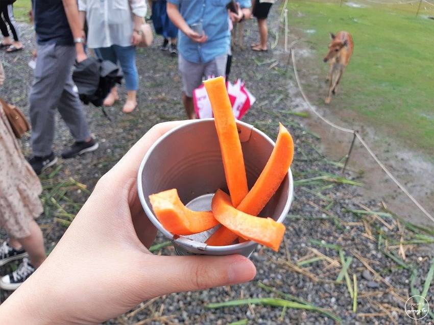 三點一到可兌換的飼料變成紅蘿蔔立刻就去換,去兌換的途中拿出飼料兌換券時還不小心被在飼料兌換區旁的梅花鹿咬了一口(眼明口快的梅花鹿),拿給工作人員時還很不好意思地告知角落被梅花鹿咬了還可以換嗎哈哈哈哈哈,這告訴我們他們是真的會吃紙的不用懷疑(當然這樣不太好),入園後請一定一定要將自己身邊的東西顧好收好不要讓梅花鹿有機可趁!!!