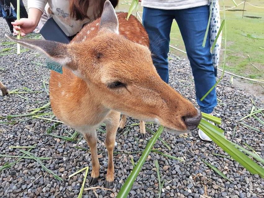 這裡的每一隻梅花鹿耳朵上都會別上編號,粗略目測應該有二十幾隻梅花鹿,這也是跟奈良的梅花鹿比較不一樣的地方(當然因為這邊有人管理),角落這隻梅花鹿很溫馴,輕輕順著頭往背上摸都不會怎麼樣(啊是要怎麼樣),就是很乖的讓你摸。XD