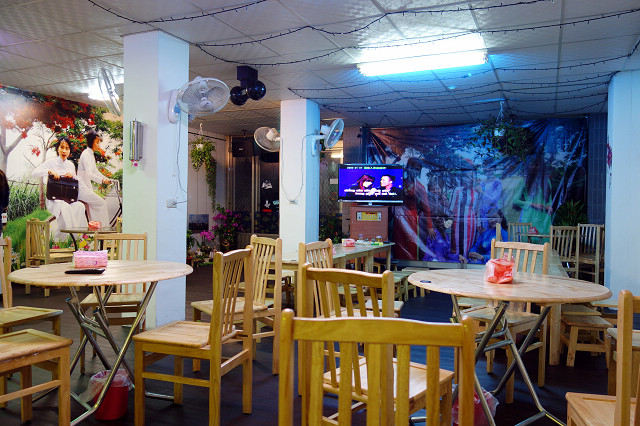 店家的裝潢很一般般,看起來就像平常會看到有附設卡拉OK的小吃店,不過仔細一聽歌曲內容,發現似乎都是播放越南歌曲,席間也有三兩位客人來用餐且盡情的大聲歡唱。一旁的牆面上也有著一張超大的越南風格的海報,看來這間越南小吃應該很道地,裝潢都很有越南風。