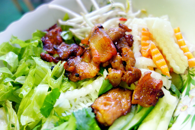 老闆說這道可說是越南傳統菜餚之一,獨門醬料醃漬後的肉片再經過炭烤後,香氣四溢,麵線、烤肉與蔬菜青木瓜一起品嚐,口感豐富多元,可說是內行人才知道的美味。