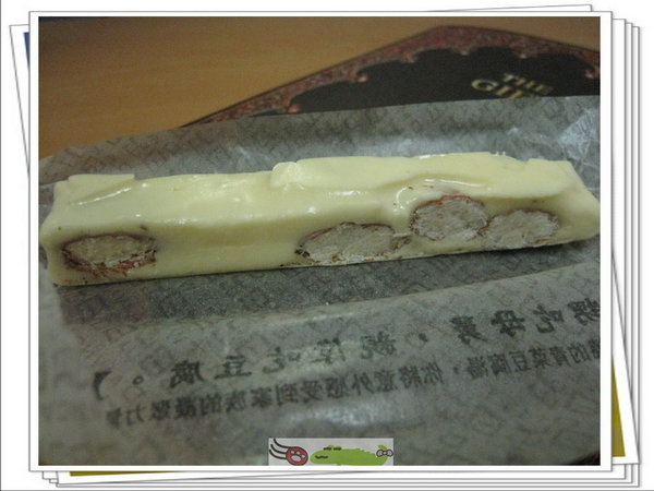 打開後就是這樣長長的一條牛軋糖。裡面不是用花生,而是用「杏仁果」,所以吃起來的口感又不大一樣,杏仁果就是比花生多了一股香味!XD