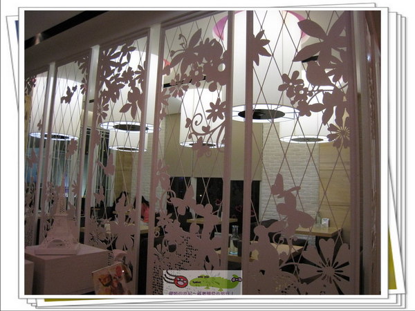一進門,整體的布置和裝潢感覺相當不錯,整個空間蠻雅致的,但是因為粉紅色用得多,所以又有點溫馨的感覺!旁邊的用餐區用白色鏤空雕花的版子和外面隔起來,感覺頗有隱私!(只要你不是說話很大聲的話~笑~)