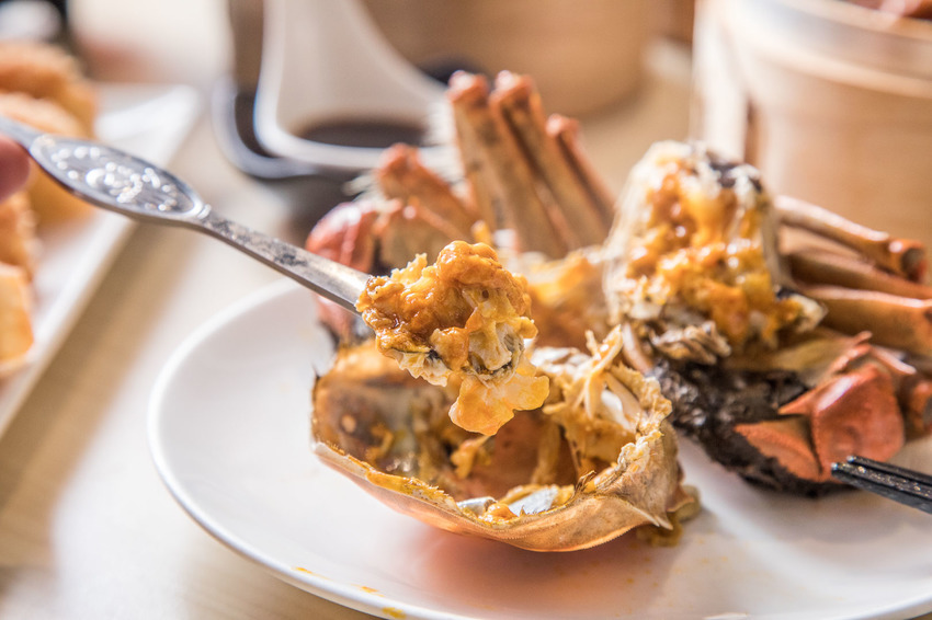 剝開蟹殼,裡頭的濃黃香醇的豐滿蟹黃及蟹膏,光看就讓人口水直流