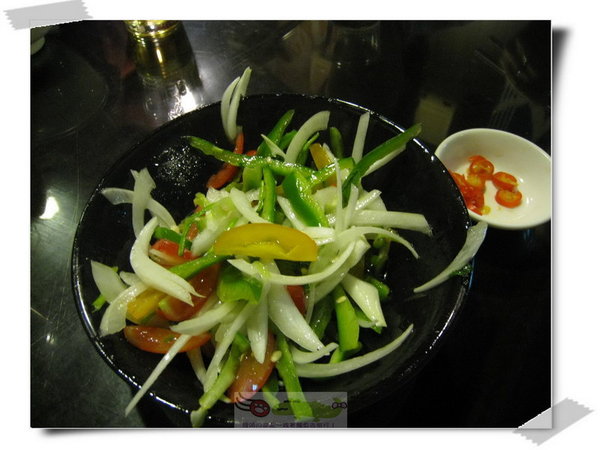 這道就比較小盤,不過也不錯,有洋蔥~青椒和紅椒,以及切塊的蕃茄!^^