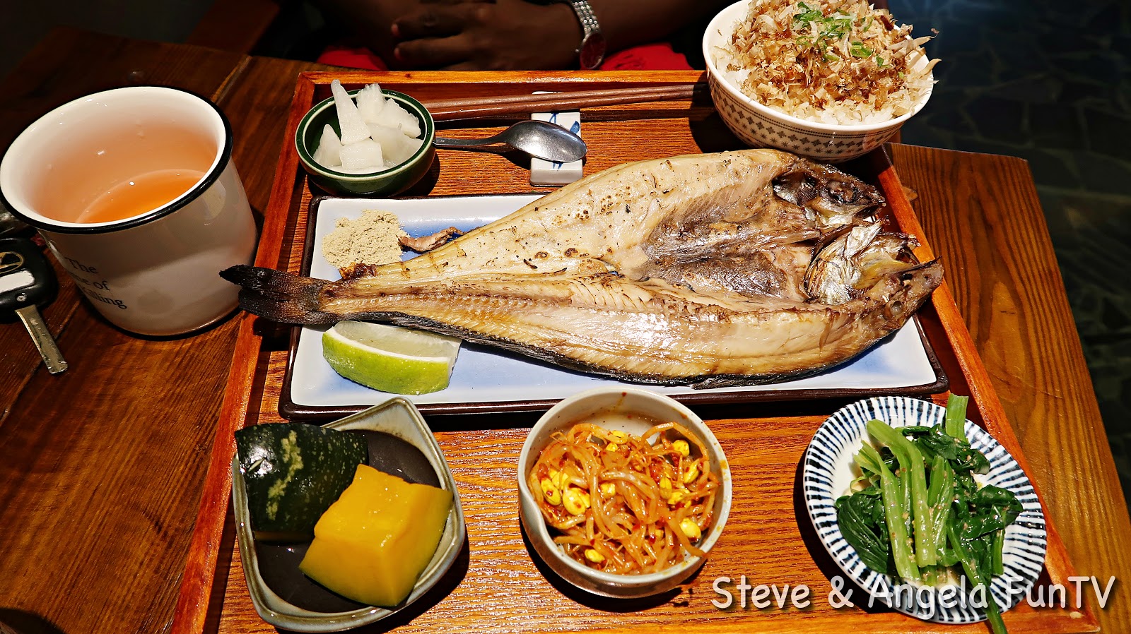 | Steve 最期待的一夜干花魚來了,好豐富喔! 一道主菜,還配上四道小菜,看起來就讓人開心! 醃漬的白蘿蔔超好吃,炒青菜淋上一點香油,超下飯! |