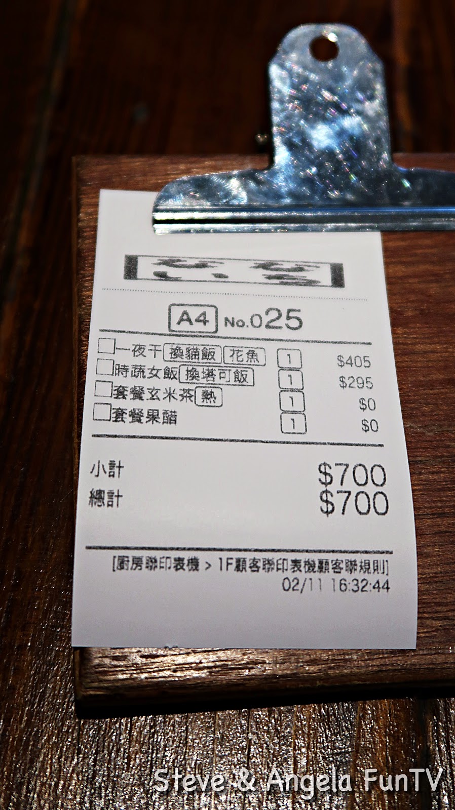 | 這是我們今天點的餐點: 一夜干北海道花魚$390+附餐飲料 果醋+升級貓飯$15 = $405 烤蔬食女飯$270+附餐飲料 玄米茶+升級沖繩塔可飯$25=$295 共$700,只收現金喔! |