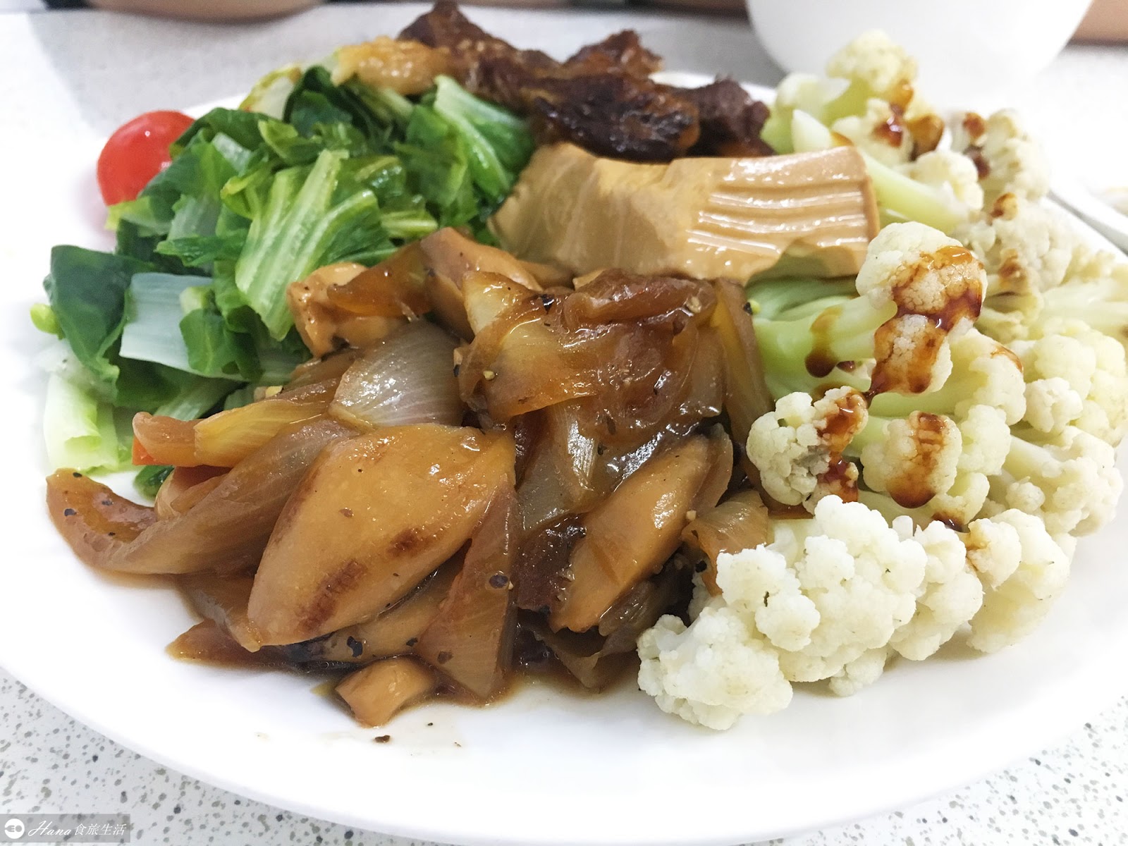 有花椰菜、豆腐、洋蔥炒杏鮑菇、青菜、番茄,