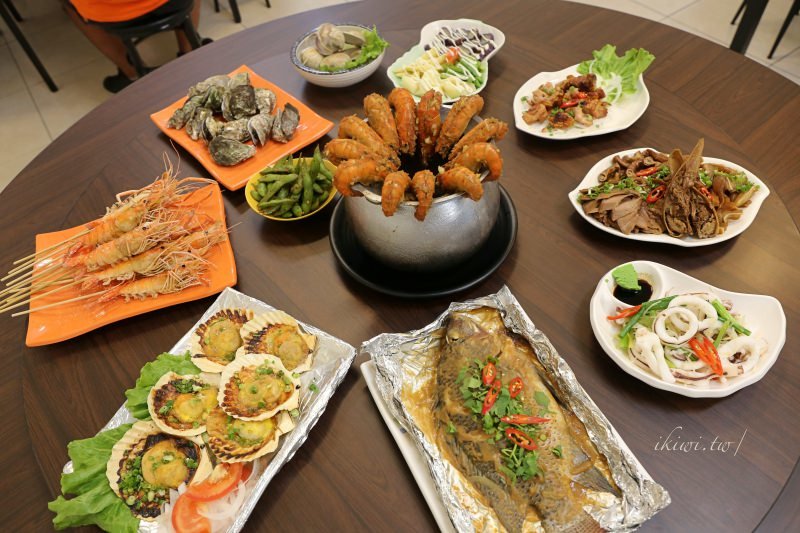 鹽烤泰國蝦一斤、蒜頭泰國蝦一斤、火烤扇貝、火烤牛奶貝、胡椒魚、生猛大鮮蚵一斤、去骨雞腿排、綜合黑白切中份、澎湖中卷、蔬菜拼盤。