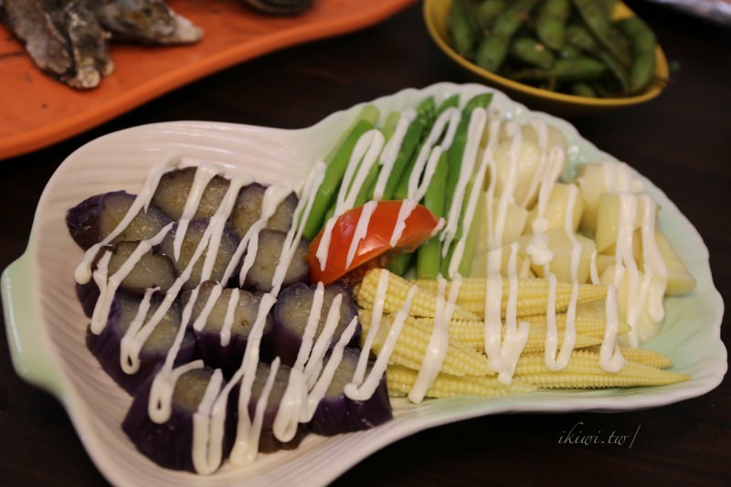 蔬菜拼盤脆$130元,有時大魚大肉會想要吃點蔬果,以當季時蔬為主,盤子裡有茄子、蘆筍、皎白筍、玉米筍,不定期更換菜色,點一盤淋上美乃滋也是個不錯的選擇。