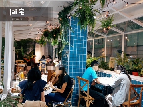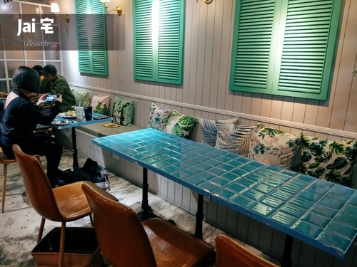 藍色海洋桌配上綠色百葉窗、大地色系座椅,估且叫它為「沙灘人生」。