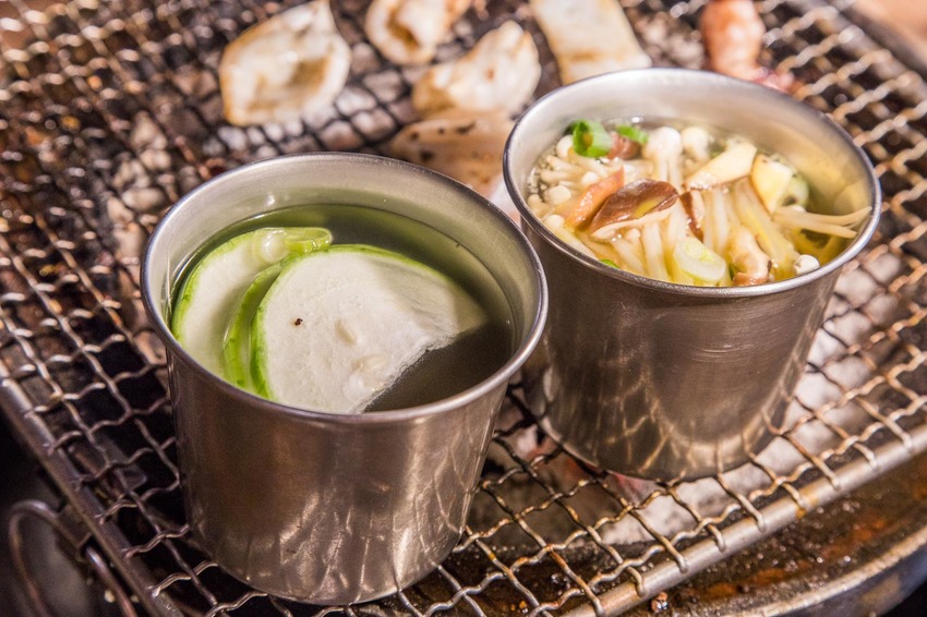 蛤蠣絲瓜&奶油金針,用鐵杯裝,還附上可愛的小蓋子,蓋上蓋子放在烤網上烤就好了,待蓋緣冒出蒸汽,裡面的湯汁沸騰就可以吃了,湯汁都保留在杯中,鮮味十足