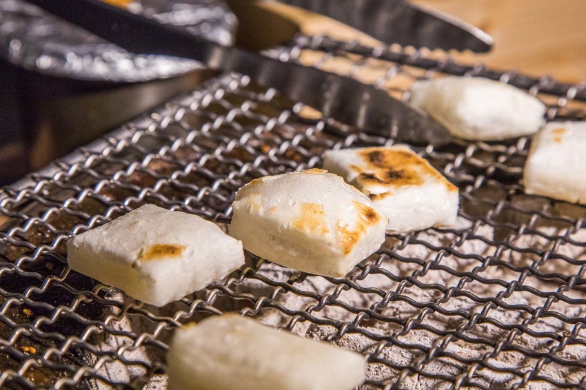 日式年糕(單點4片50)吃燒烤怎麼可以不來一份烤年糕,看似簡單的烤年糕,其實還蠻多人不會烤的,服務生也分享一個小訣竅,在烤的時候不時用鐵夾夾麻吉,如果軟軟澎澎的就可以吃了,將烤好的年糕沾上煉乳裹上花生糖粉,麻吉吃起來甜甜軟軟,很適合當作結尾的甜點享用