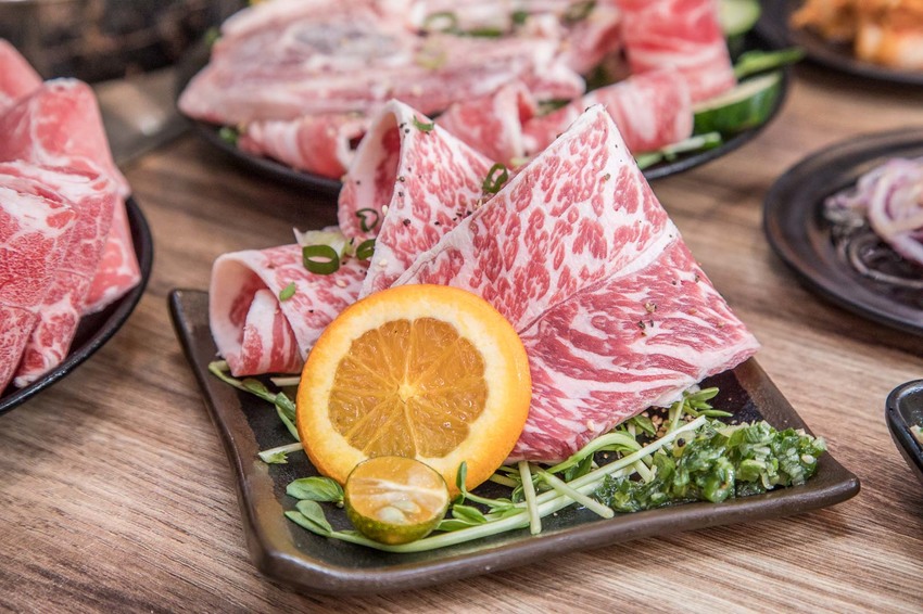 西歐梅花豬,一般去燒肉店咬咬很少點梅花豬肉,因為外層都有很難咬的筋膜,這裏特別將多餘的筋膜剃除,將梅花豬肉修成圓形,將肥瘦肉的比例拿捏到最佳品質