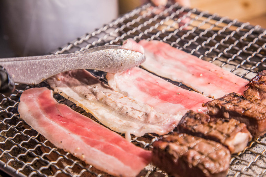 隨著碳火的燒烤,稍有厚度的梅花豬肉表面開始湧出充沛的肉汁,看到肉汁湧出即可翻面,將邊緣烤至焦黃就可以吃了,這裡的梅花豬肉真的超有水準,因為剃除多餘的筋膜,肥肉與瘦肉的完美比例,所以吃起來格外軟嫩