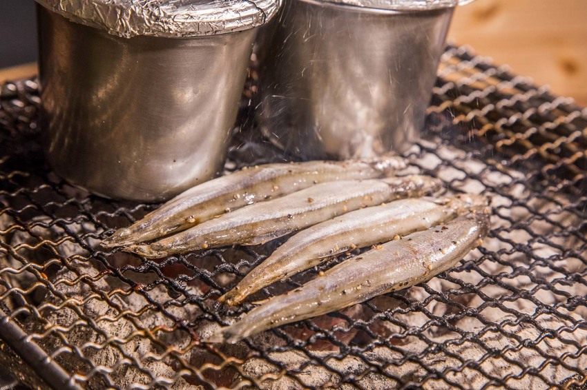 柳葉魚,烤柳葉魚時先墊起一邊,因為尾巴容易燒焦,先墊起一邊受熱會比較均勻,當魚皮黏附在烤網時,將柳葉魚連同網子一起翻過來,都不會掉耶!這烤出來的柳葉魚魚皮不破損,帶卵柳葉魚吃來外酥內軟好鮮香!