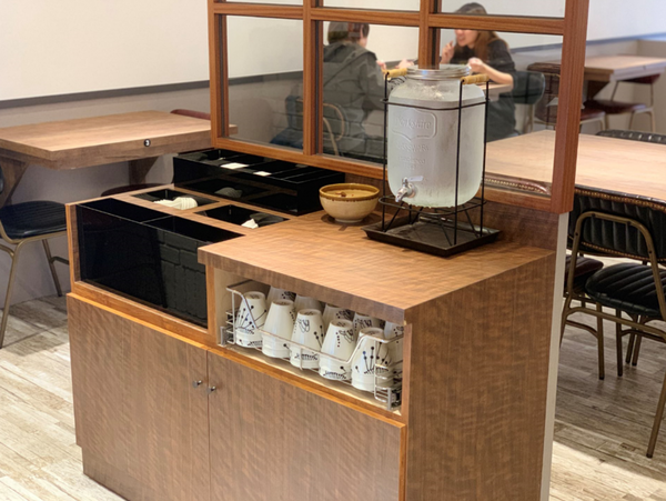 ▼採取自助式的茶水、餐具區