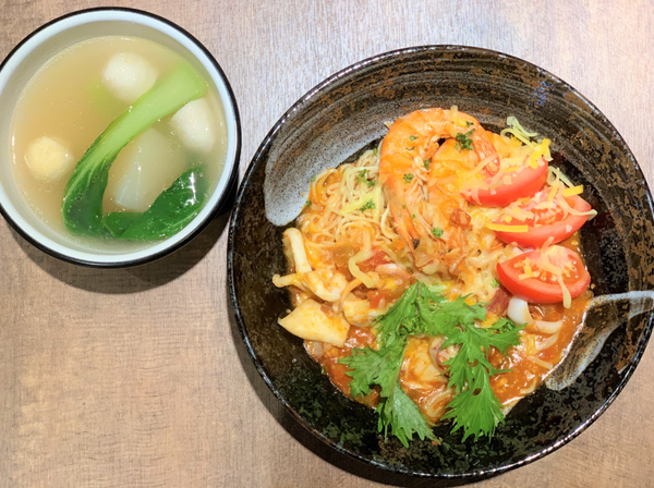 ▼二鬼麵舖 乾拌麵系列:番茄起司海鮮麵+套餐湯品蔬菜丸子湯$270