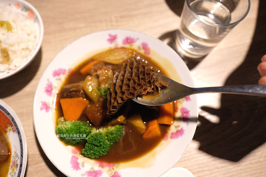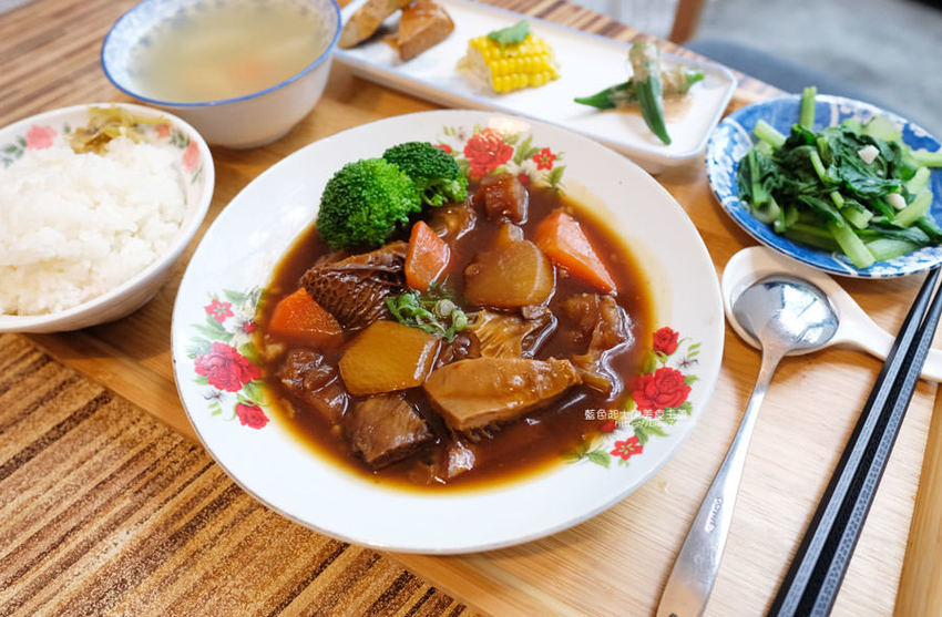 好懷念的復古盤子,中午自然光下,拍起來滿加分的,紅燒牛三寶熬煮的超透的,會一直扒飯的