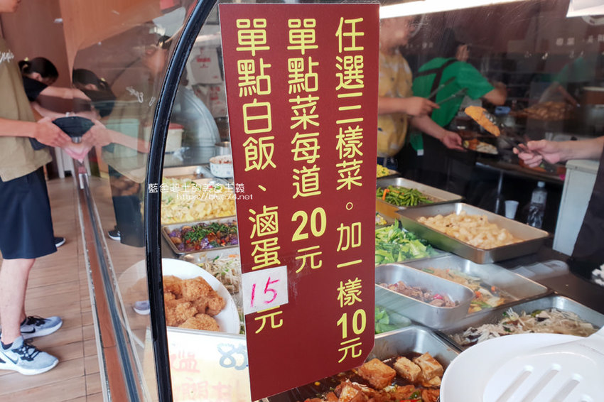 任選三樣菜,加一樣10元,單點菜每道20元,單點白飯、滷蛋15元。