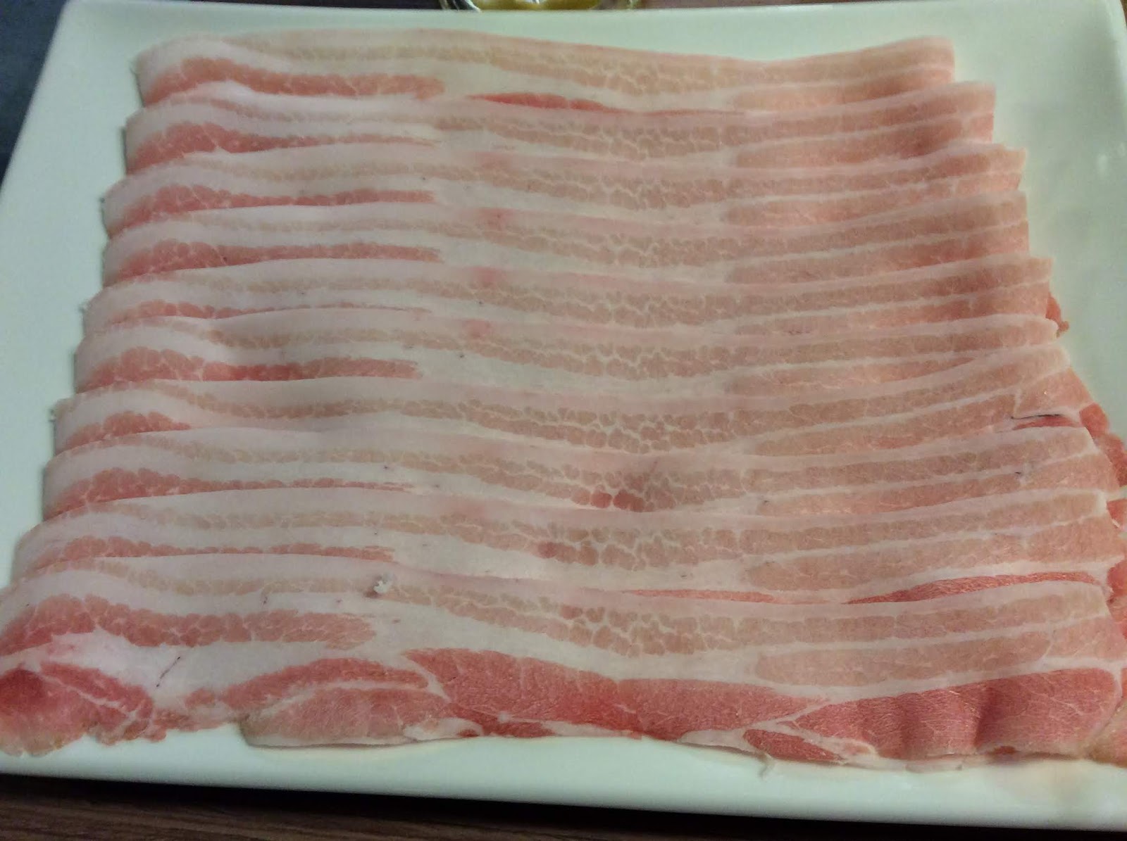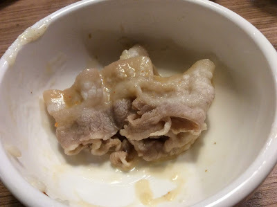 這種豬五花肉片下鍋涮涮就熟了,捲曲的肉片已看不到肥油,